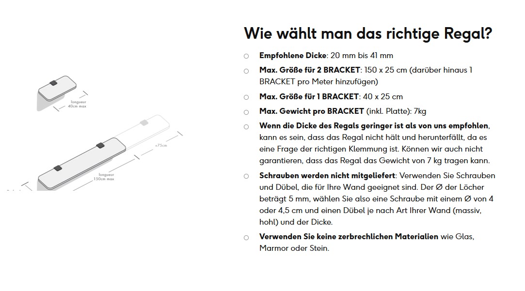 - Wenn die Dicke des Regals geringer ist als von uns empfohlen, kann es sein, dass das Regal nicht hält und herunterfällt, da es eine Frage der richtigen Klemmung ist. In dem Fall können wir nicht garantieren, dass das Regal das Gewicht von 7 kg tragen kann.