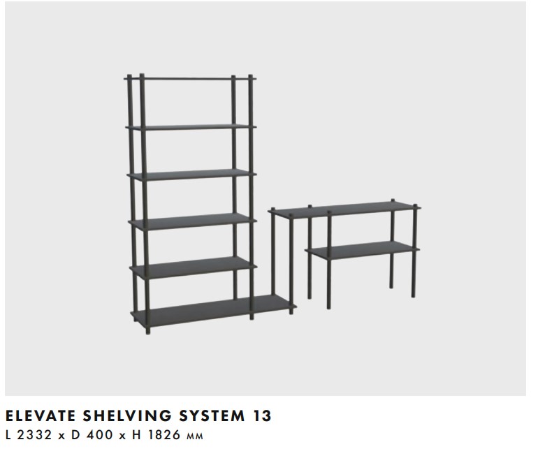 Elevate ist ein modulares Regalsystem mit endlosen Möglichkeiten. Mit verschiedenen Regalen und Dübeln kann Elevate ohne Verwendung von Werkzeugen in einer unbegrenzten Anzahl von Permutationen erweitert und zusammengebaut werden.