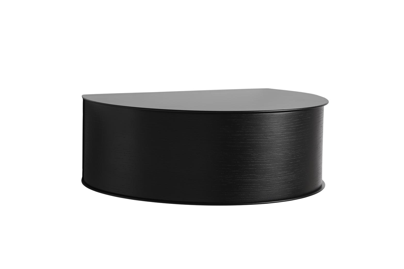 Das Design regal Wallie kombiniert gebogene Eiche mit massivem schwarzem Metall und schafft so eine elegante Wandschublade. Mit seinen kreisrunden, weichen Formen ist Wallie ein visuell starkes Design, das sich leicht wie ein Herzstück verhalten oder mit anderen Designs kombiniert werden kann.