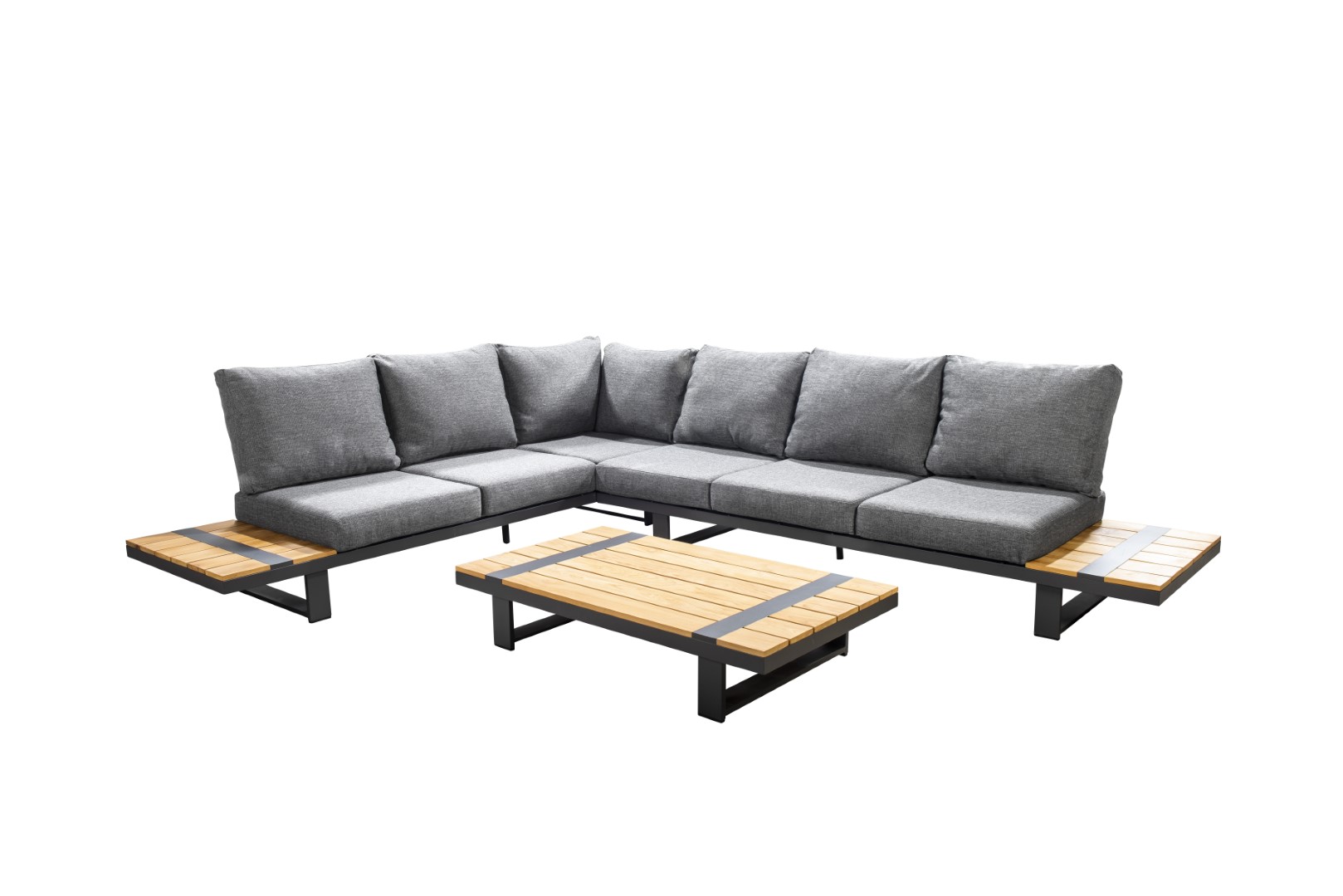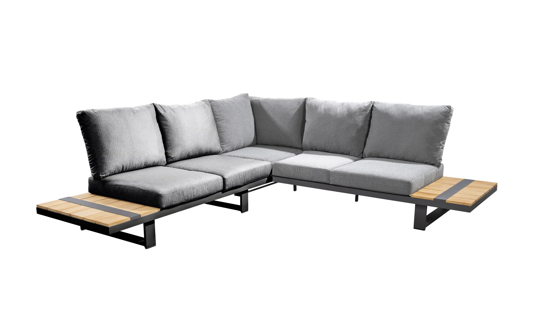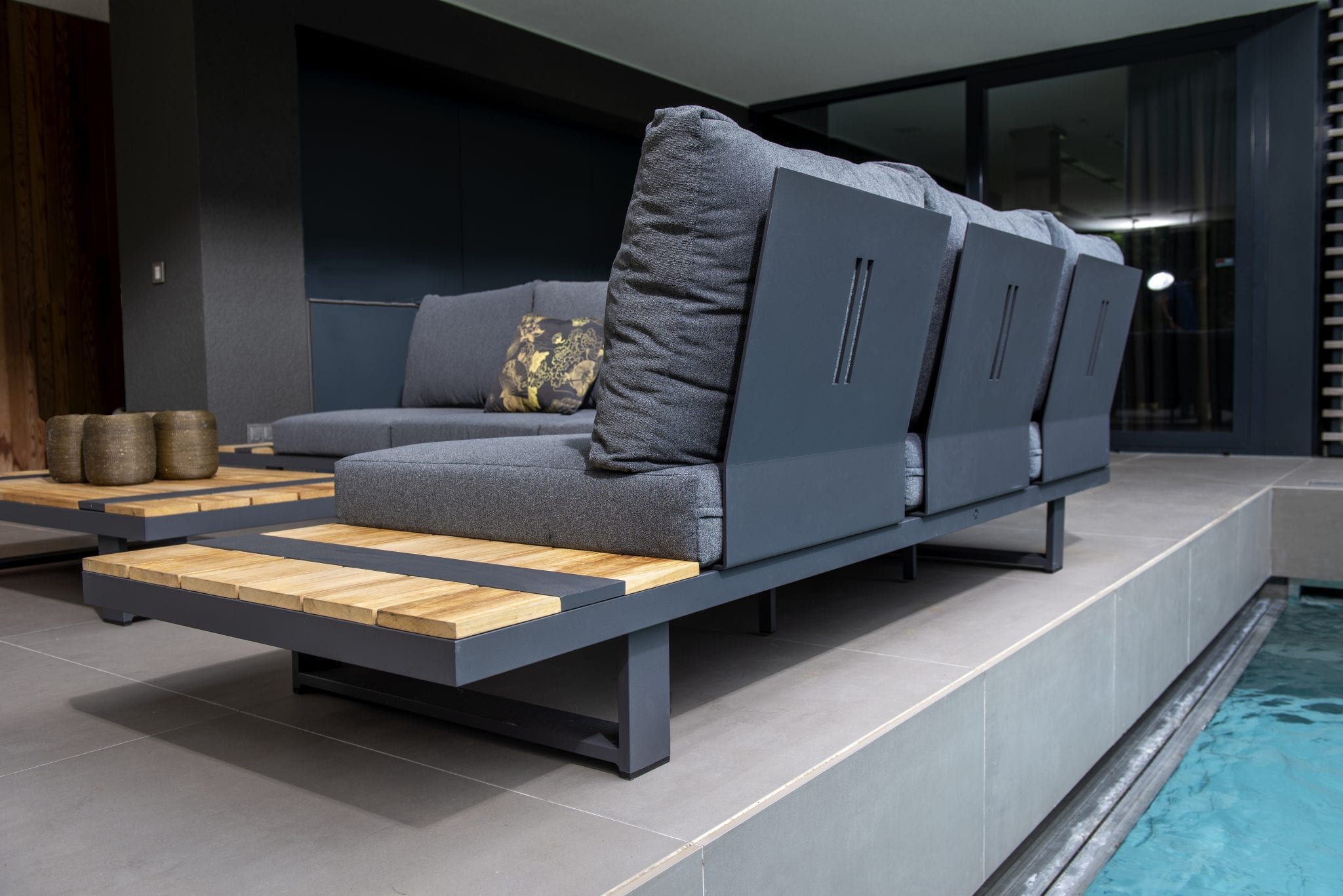 Das Aluminiumgestell in elegantem Schwarz matt lackiert, kombiniert mit den dunkelgrauen Sitzkissen und UV-beständigen Bezügen, bietet nicht nur einen ästhetisch ansprechenden Look, sondern auch Langlebigkeit gegenüber den Elementen.