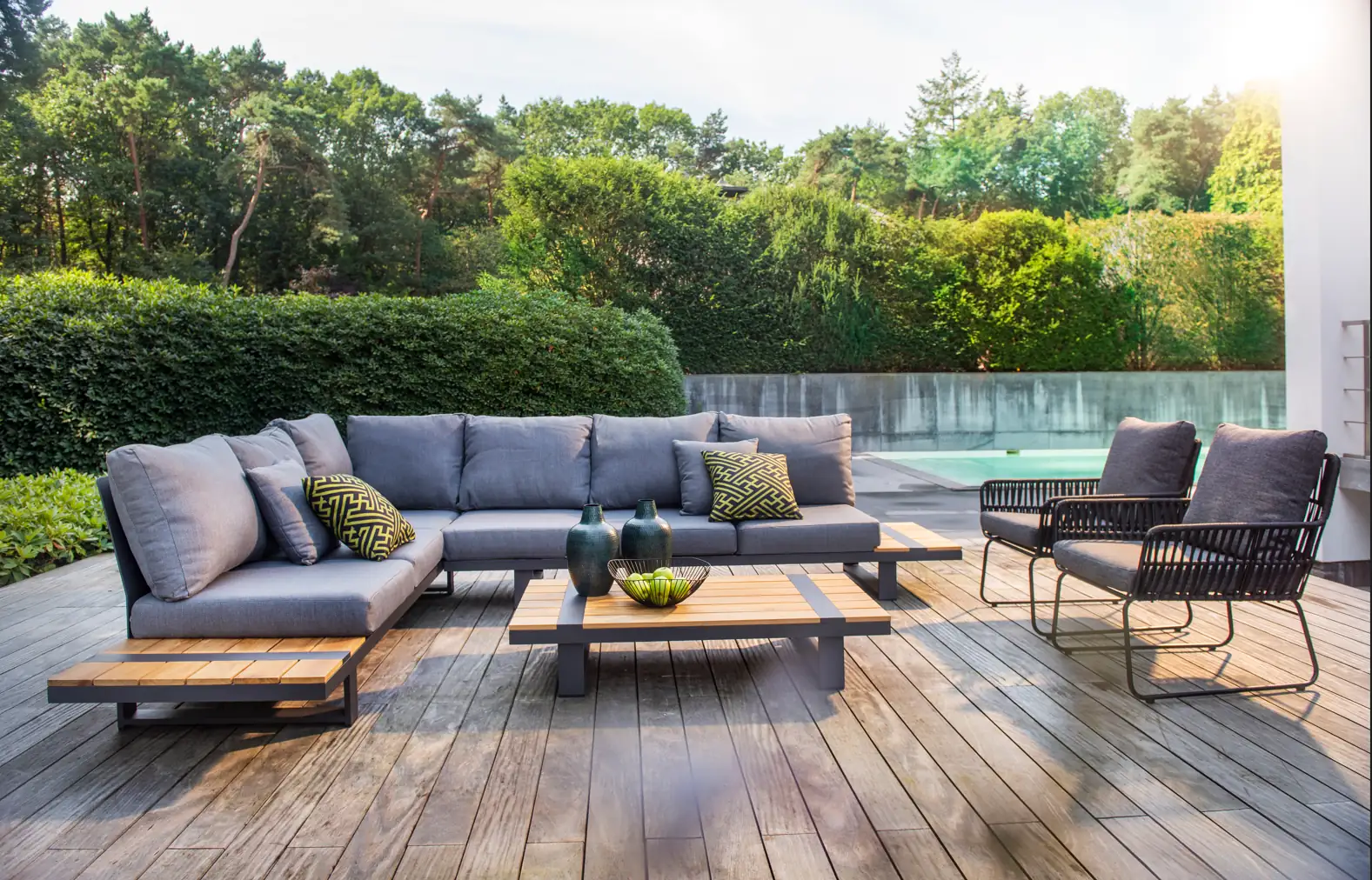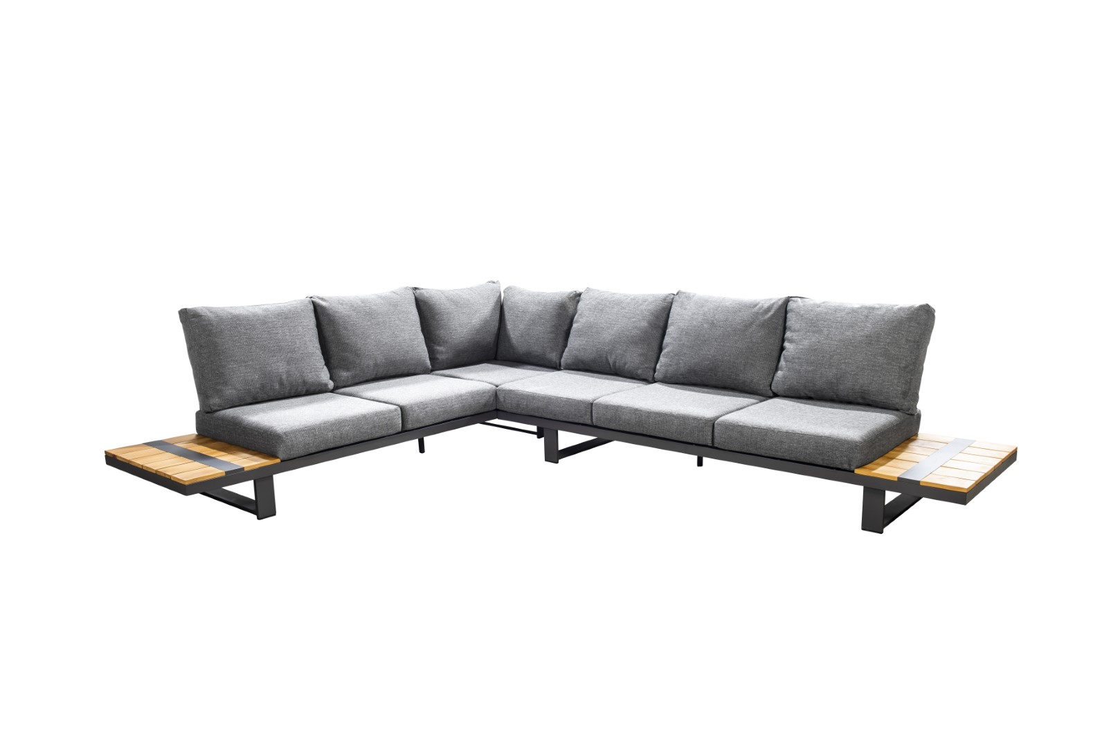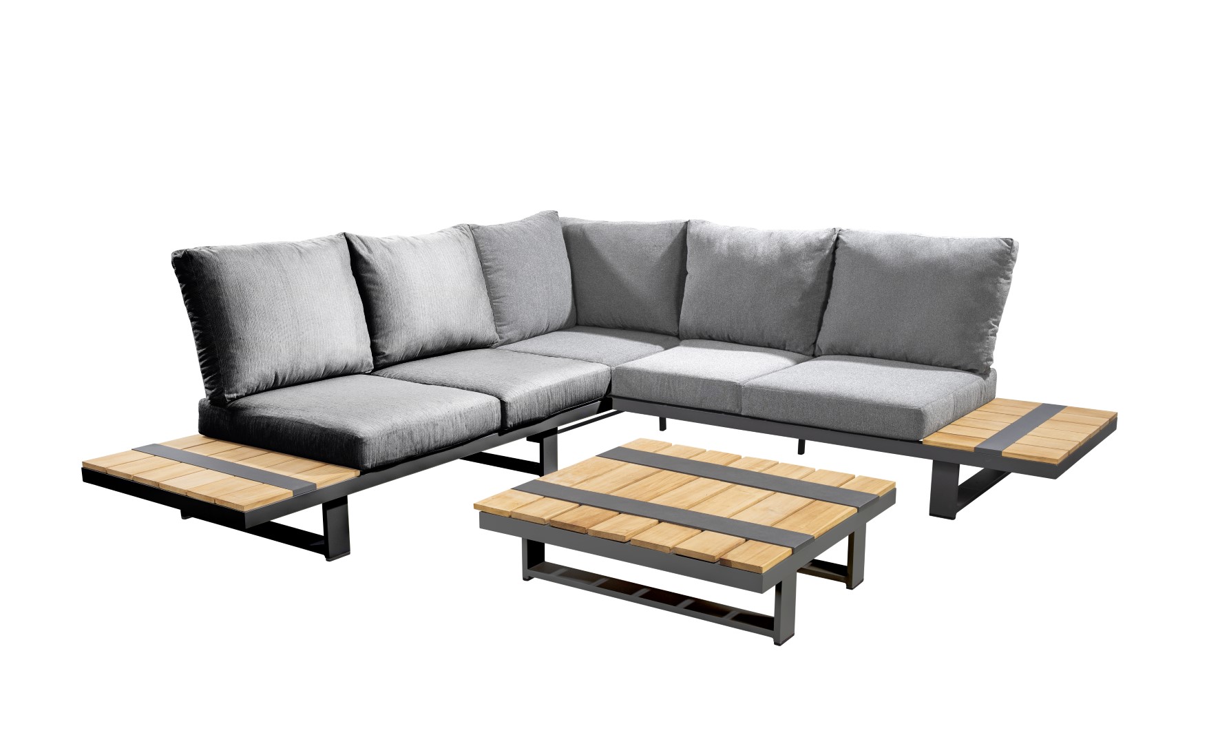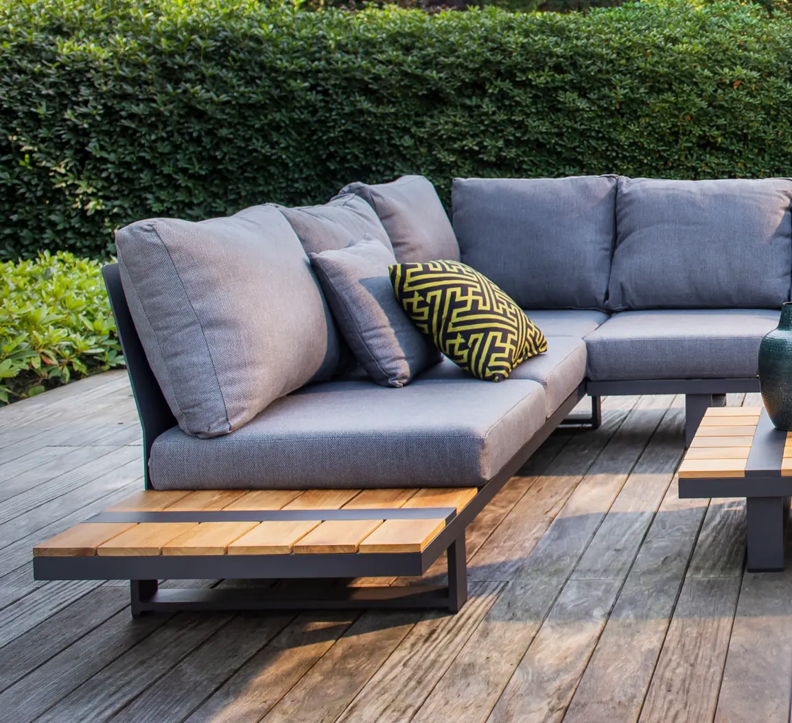 Die großzügigen und weichen Kissen laden dich ein, dich zurückzulehnen und zu genießen, während die natürlichen Teakholz-Details einen Hauch von Natürlichkeit und Eleganz hinzufügen.